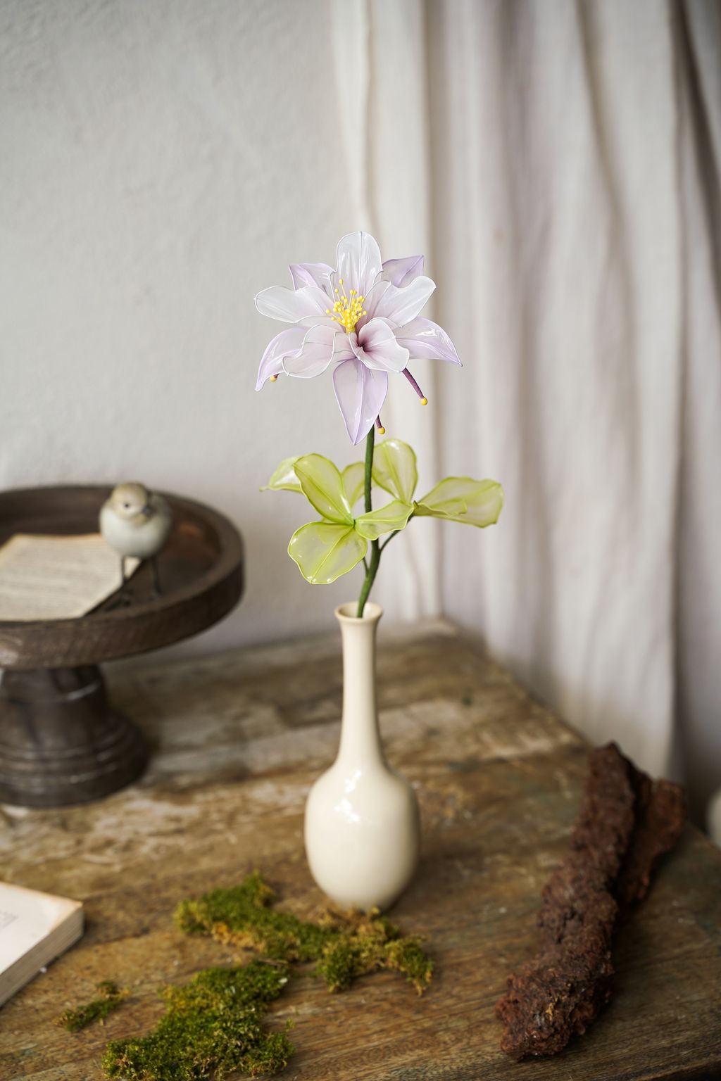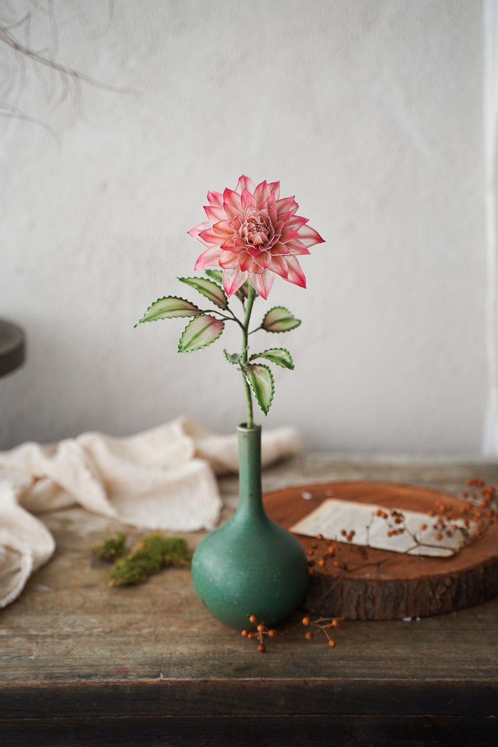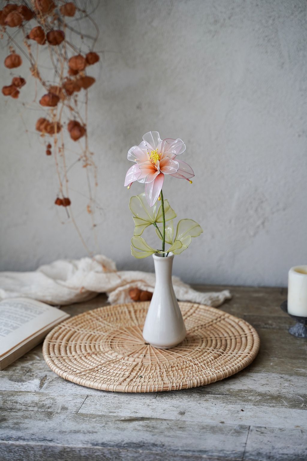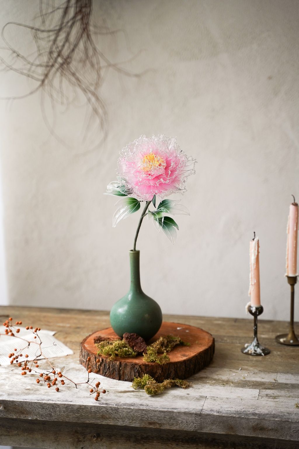 水晶花是一門手工藝與花藝設計的結合,透過鐵絲凹折成花瓣與葉子的架構,於造花液浸沾一層薄膜,待風乾後呈現透亮質地,最後組合與姿態造型。